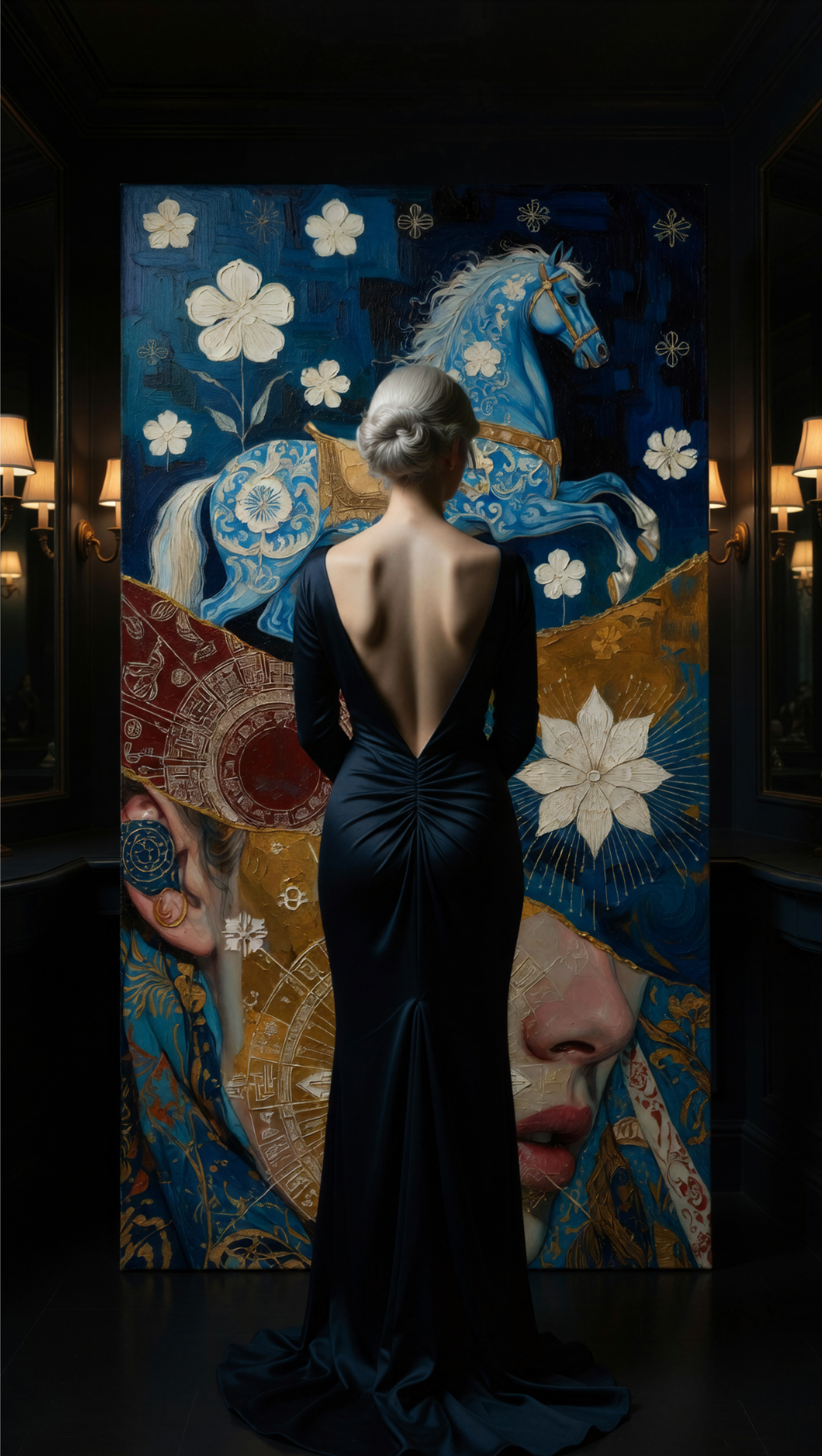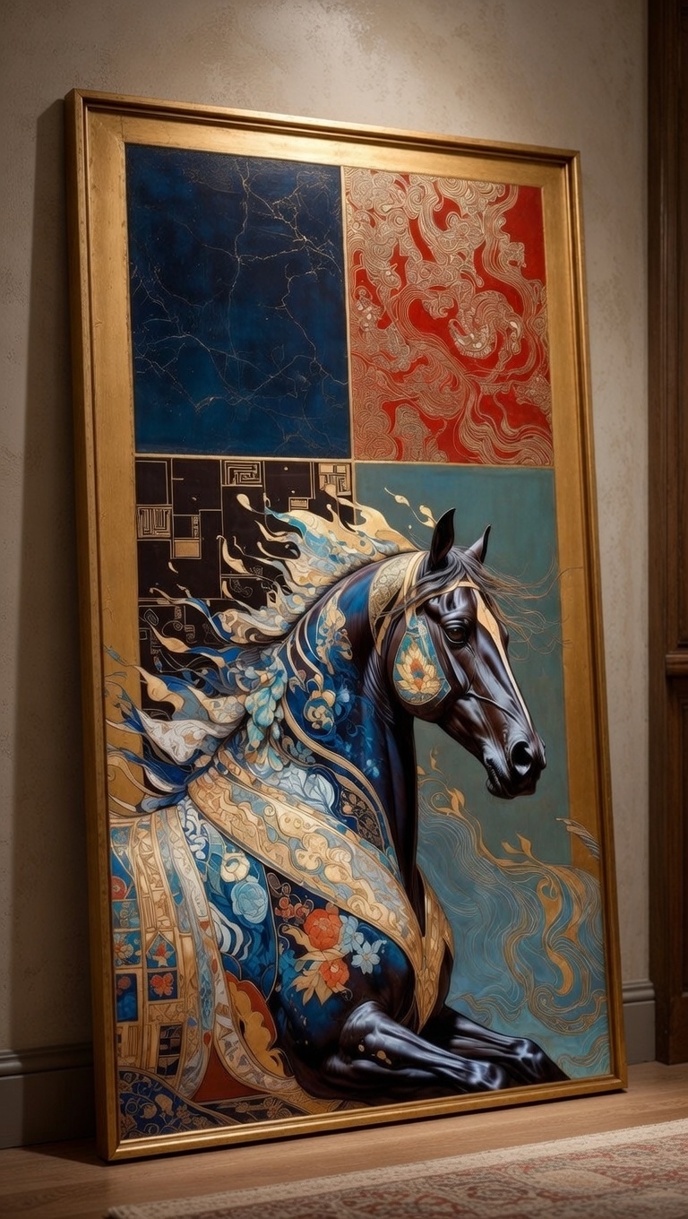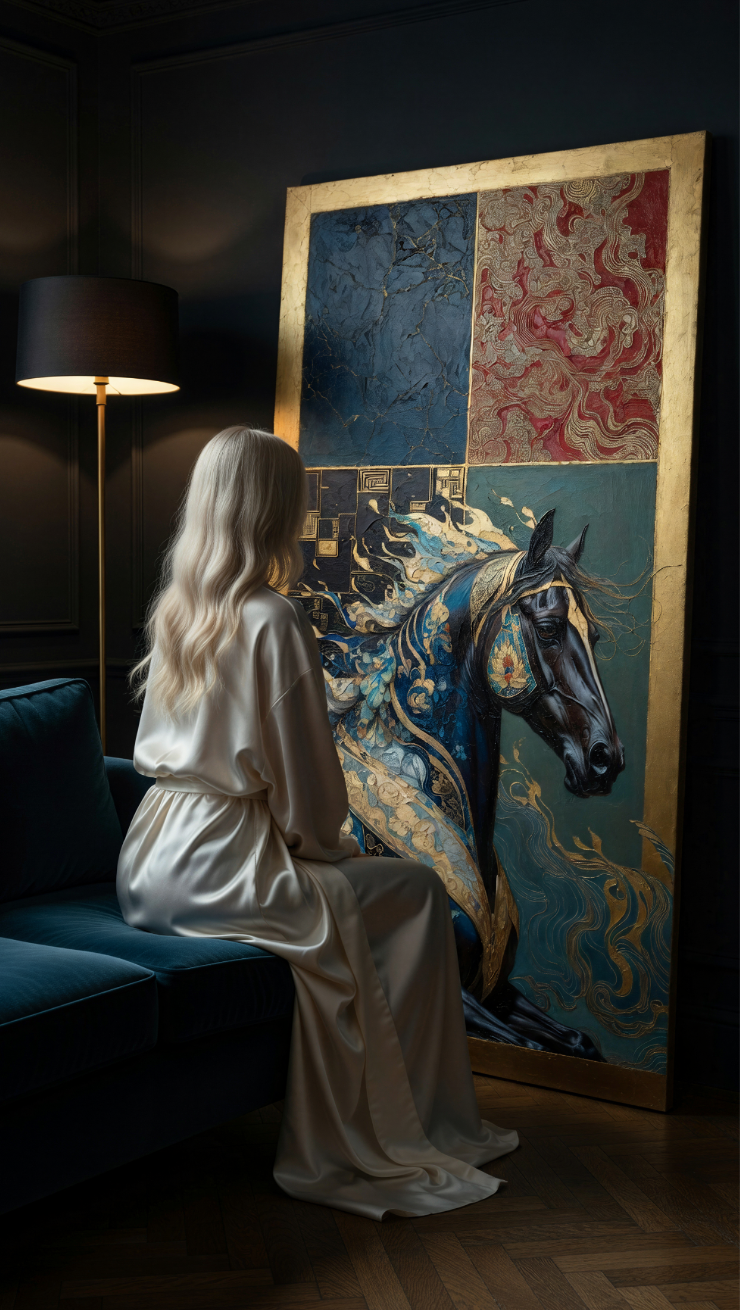 Синий конь — мощь и свобода, золотая грива/цветы — женская нежность и рост, красный шёлк — страсть и защита дома,