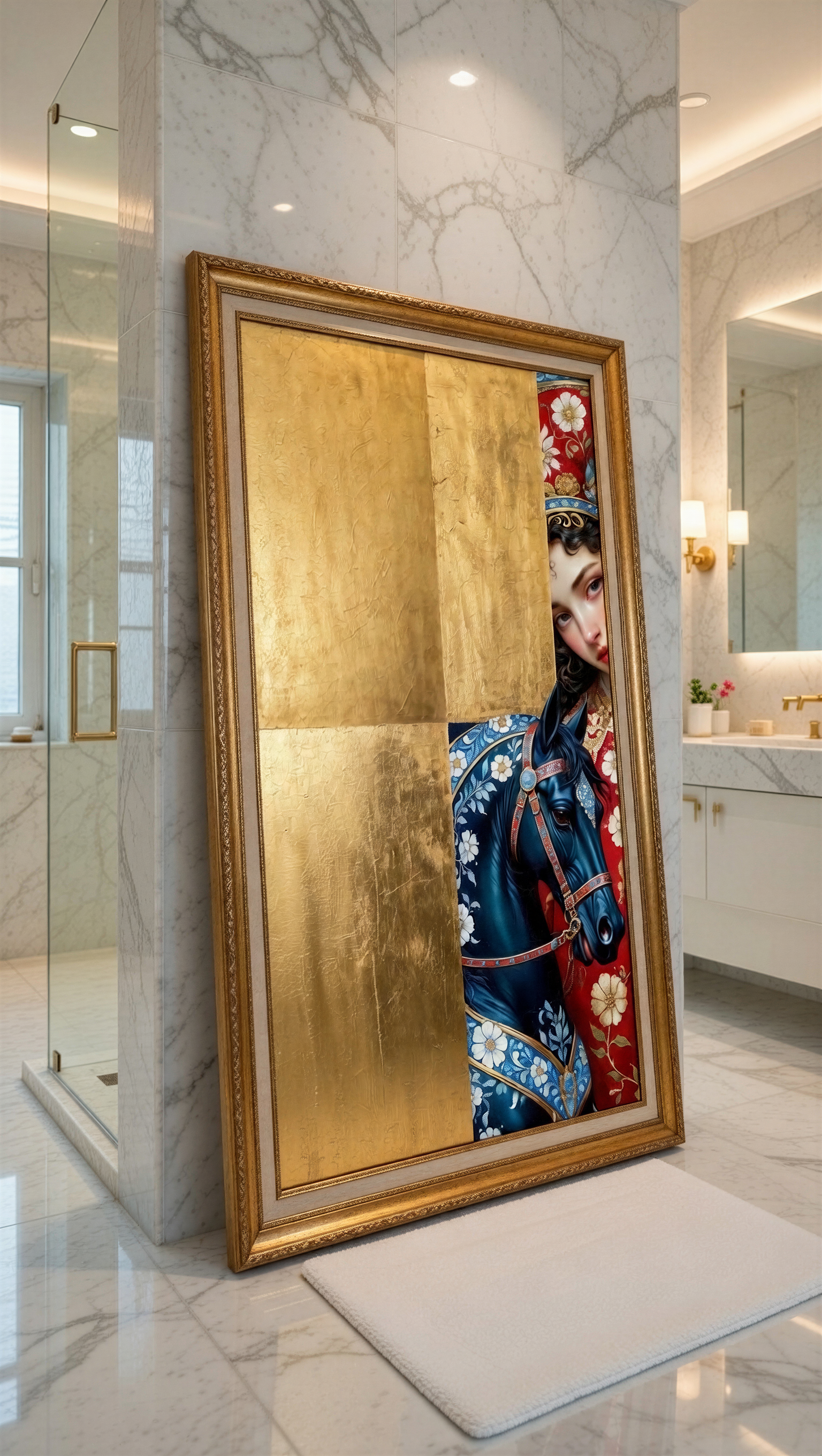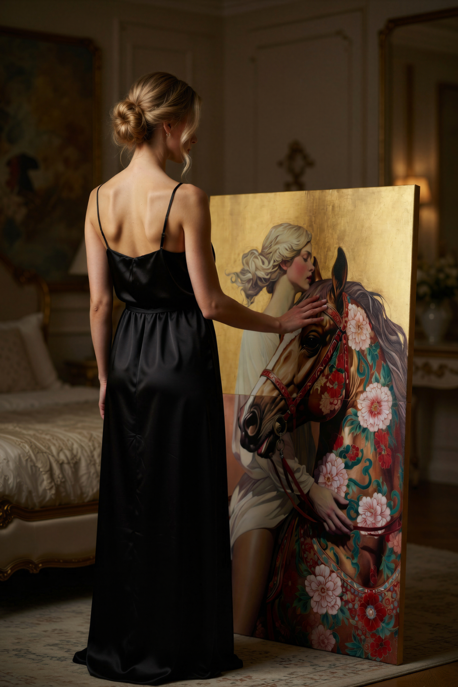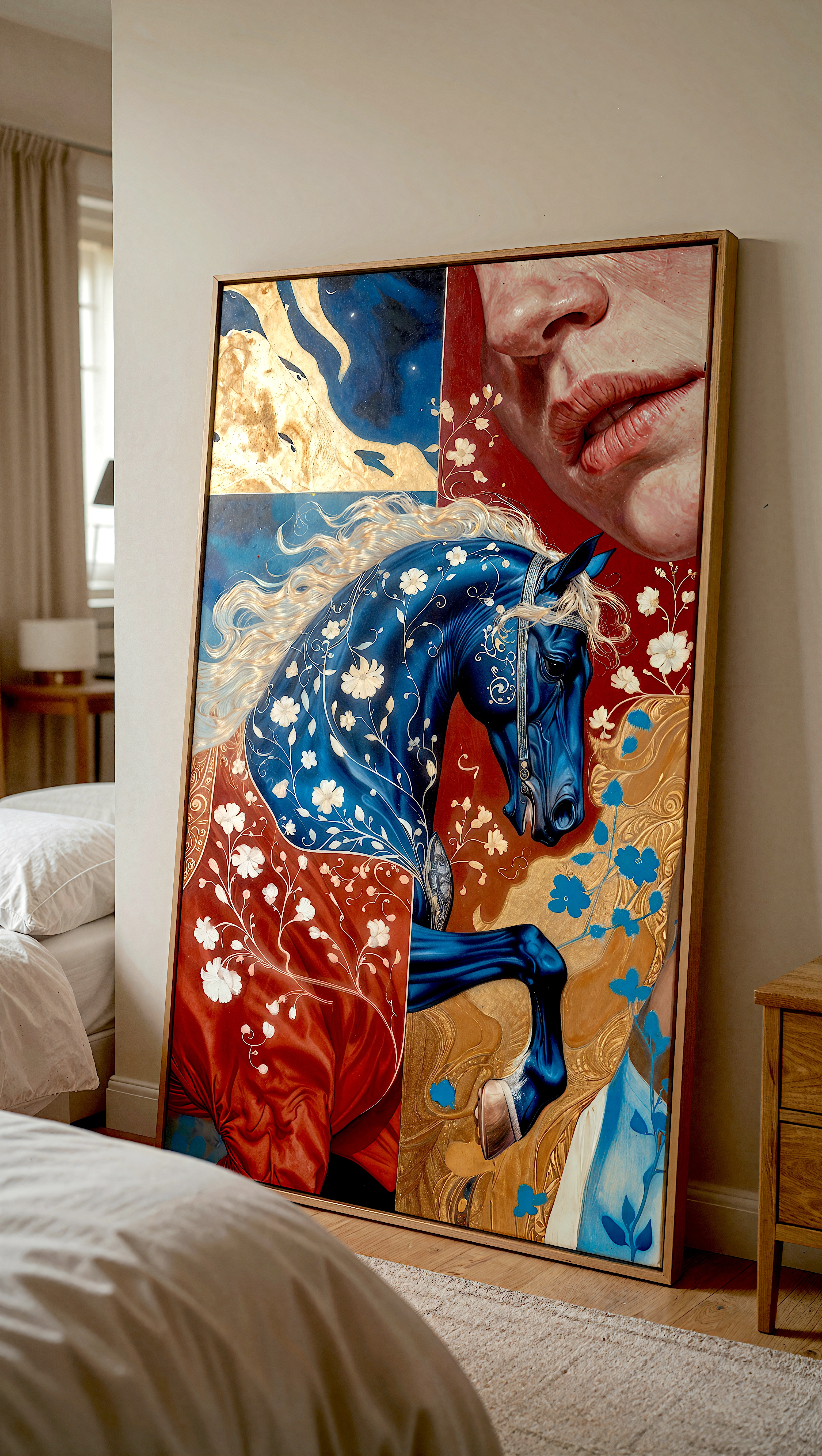 Синий конь — мощь и свобода, золотая грива/цветы — женская нежность и рост, красный шёлк — страсть и защита дома,